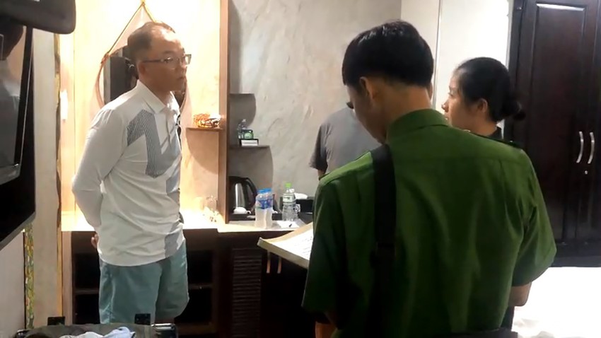 Công an đọc lệnh khám xét, bắt giữ Seong Hyun tại khách sạn. Ảnh: CA |