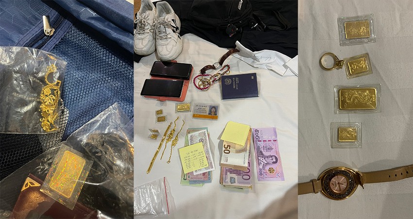 Các miếng vàng tang vật được nhóm này cất giấu trong hành lý. Ảnh: CA |