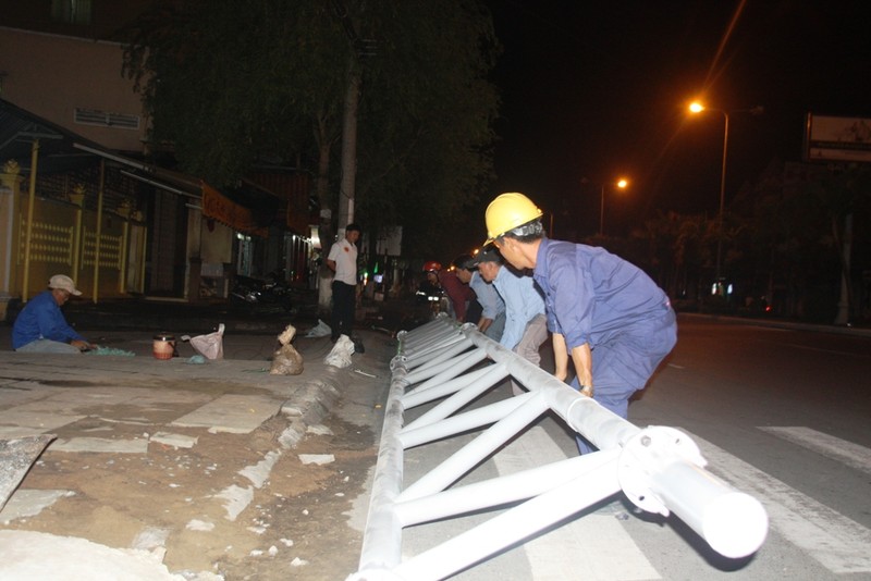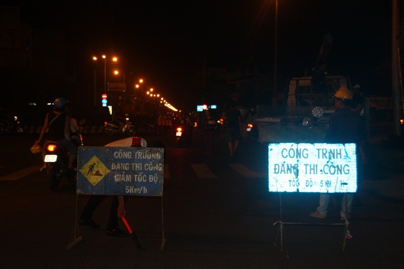 Công nhân khẩn trương làm việc xuyên đêm để kịp phục vụ giao thông vào sáng hôm sau, 28-4.