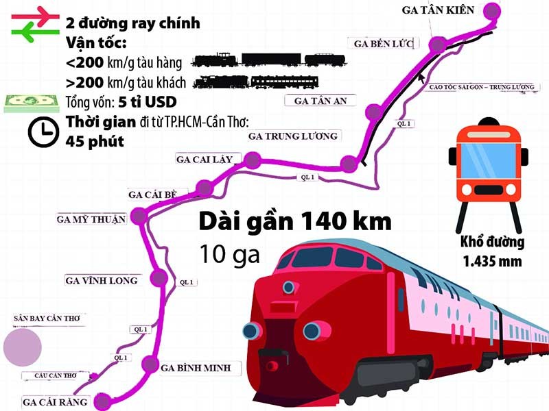 - Điểm đầu tàu khách: Ga Tân Kiên, huyện Bình Chánh, TP.HCM. - Điểm cuối: Ga Cái Răng, quận Cái Răng, TP Cần Thơ. - Tuyến đường sắt có 10 ga và đi qua năm tỉnh, TP gồm: TP.HCM, Long An, Tiền Giang, Vĩnh Long, Cần Thơ. - TP.HCM: Tàu sẽ đi qua Thủ Đức, quận 12, Hóc Môn, Bình Tân, Bình Chánh với chiều dài 36,282 km gồm năm ga và trạm khách. - Long An: Tàu đi qua Cần Giuộc, Bến Lức, Tân Trụ, TP Tân An, Châu Thành. - Tiền Giang: Tàu đi qua Chợ Gạo, TP Mỹ Tho, Châu Thành, Cai Lậy, Cái Bè. - Vĩnh Long: Tàu đi qua TP Vĩnh Long, Long Hồ, Tam Bình, Bình Minh. - TP Cần Thơ: Tàu đi qua quận Cái Răng với chiều dài 5,177 km. |