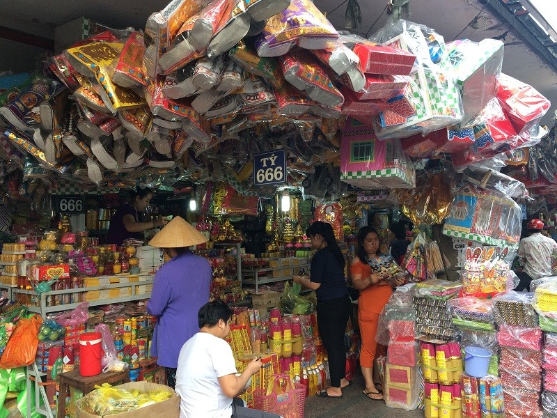 Các mặt hàng cúng lễ được trưng bày đỏ rực cả con phố, tấp nập người ra vào mua bán. Ngay từ sớm, nhiều người tranh thủ mua đồ để kịp cho lễ cúng Táo Quân.