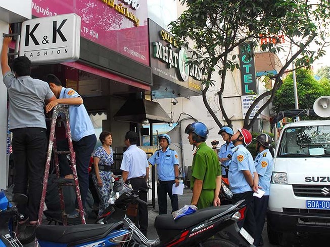 Lực lượng chức năng tháo gỡ những vật dụng lấn chiếm vỉa hè. Ảnh: HOÀNG GIANG