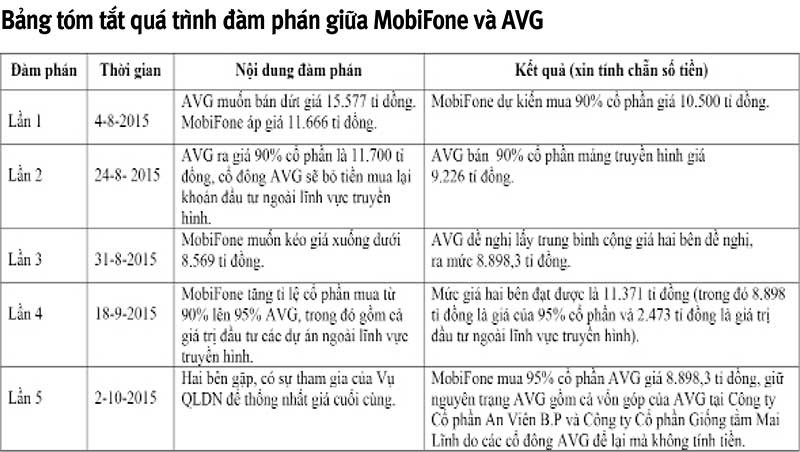 Cụ thể, ngày 4-8-2015, đại diện nhóm cổ đông của AVG phát công văn đề nghị MobiFone mua đứt AVG với giá khoảng 15.577 tỉ đồng. AVG cũng lưu ý riêng mảng truyền hình đã trị giá 600 triệu USD.
