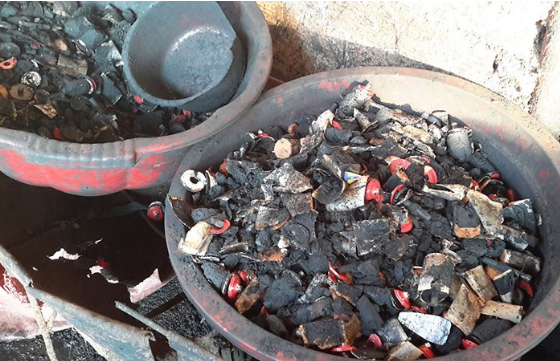 Số lõi pin dùng để nhuộm cà phê được phát hiện tại cơ sở. Ảnh: Báo Thanh Niên