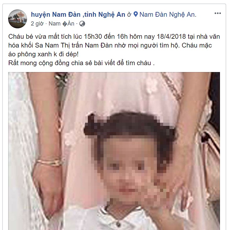 Trên trang Facebook huyện Nam Đàn, tỉnh Nghệ An cũng đăng ảnh cháu bé và viết: “Cháu bé vừa mất tích lúc 15h30 đến 16h hôm nay 18-4-2018 tại nhà văn hóa khối Sa Nam Thị trấn Nam Đàn nhờ mọi người tìm hộ. Cháu mặc áo phông xanh k đi dép! Rất mong cộng đồng chia sẻ bài viết để tìm cháu”.