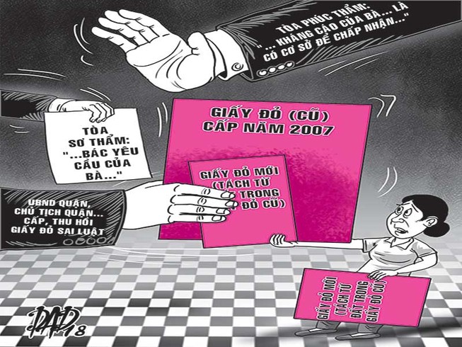 Tháng 9-2010, bà H. làm thủ tục tách giấy đỏ diện tích đất nêu trên ra làm hai giấy khác nhau. Đến đầu năm 2011, UBND quận Ninh Kiều ban hành Quyết định 660 thu hồi giấy đỏ cũ của bà H. vì lý do cấp sai trình tự thủ tục. Bà H. khiếu nại thì chủ tịch UBND quận Ninh Kiều ban hành quyết định bác đơn khiếu nại của bà nhưng vẫn thu hồi một trong hai giấy đỏ mới tách.