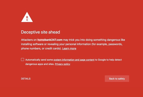 Trình duyệt Google Chrome ngay lập tức hiển thị cảnh báo nguy hiểm đối với các trang web giả mạo, có khả năng gây nguy hại cho người dùng. Ảnh: TIỂU MINH