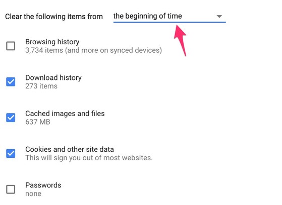 Tại đây, người dùng có thể xóa lịch sử lướt web (Browsing history), lich sử tải về (Download history), tập tin tạm (Cached images and files) và dữ liệu website (Cookies and other site data)… lựa chọn mốc thời gian cần xóa là the beginning of time rồi nhấn Clear Browsing Data.