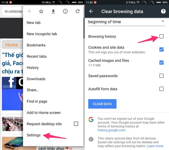 Tương tự, nếu đang sử dụng Google Chrome trên Android hoặc iOS, bạn hãy chạm vào biểu tượng menu ở góc trên bên phải và chọn Settings > Privacy > Clear Browsing Data. Tiếp theo, người dùng chỉ cần đánh dấu vào các dữ liệu cần xóa rồi nhấn Clear Data.