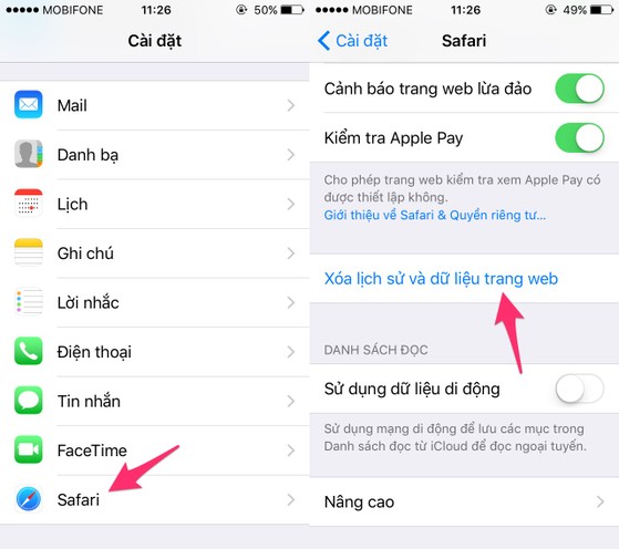 Để xóa lịch sử duyệt web trên trình duyệt Safari (iPhone, iPad), bạn hãy truy cập vào Settings (cài đặt) > Safari > Clear History and Website Data (xóa lịch sử và dữ liệu trang web) > Clear History and Data (xóa lịch sử và dữ liệu). Lúc này, tất cả dữ liệu nhạy cảm bao gồm cookies, bộ nhớ cache… sẽ bị xóa sạch.