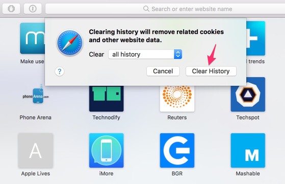 Tương tự như trên, bạn chỉ cần mở trình duyệt và bấm vào menu Safari > Clear History. Lựa chọn khoảng thời gian cần xóa rồi nhấp vào nút Clear History. Lúc này, toàn bộ dữ liệu lướt web cũng như cookies, tập tin tạm… sẽ bị xóa sạch.
