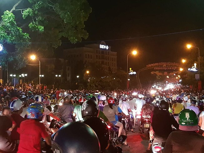 Nhiều người tụ tập gây ách tắc giao thông tại Bình Thuận tối 11-6. Ảnh: PN