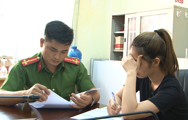 Trần Giảng Ý Huệ làm việc với công an. Ảnh CA.