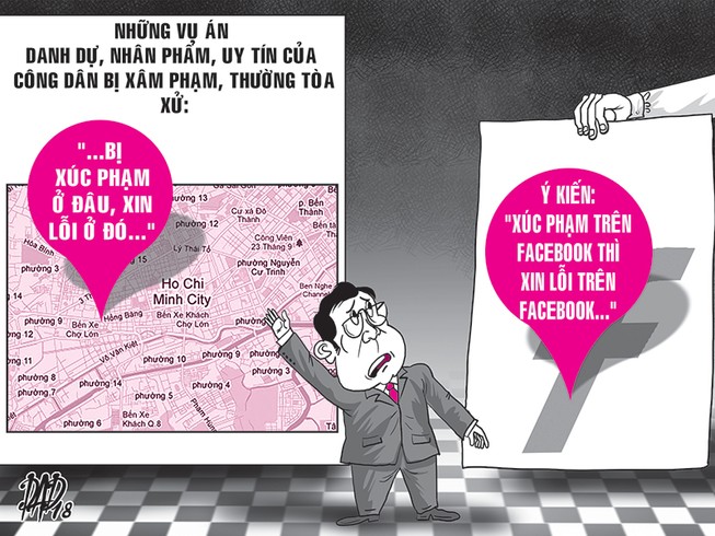 Vấn đề là việc xin lỗi, cải chính công khai đó thực hiện ở đâu thì BLDS 2015 lại không quy định cụ thể. Trong thực tiễn xét xử, các tòa áp dụng nguyên tắc “bị xúc phạm ở đâu thì xin lỗi ở đó”. Ví dụ: Xúc phạm hàng xóm thì buộc xin lỗi tại cuộc họp tổ dân phố, xảy ra ở nơi làm việc thì tổ chức xin lỗi tại nơi làm việc. Tuy nhiên, xúc phạm người khác trên mạng xã hội thì trước nay chưa có tiền lệ là tòa buộc xin lỗi trên mạng xã hội.