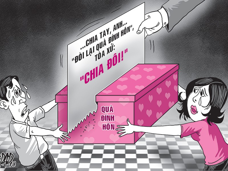 Từ đó cả chị T. cũng như cha mẹ chị là ông K., bà D. tuyên bố hủy hôn vì cho rằng gia đình anh H. không cho chị T. đi làm sau khi cưới. Khoảng tháng 10-2016 gia đình anh H. có đến nhà chị T. lần thứ hai để thương lượng việc tổ chức lễ cưới nhưng phía chị T. kiên quyết hủy hôn. Anh H. khởi kiện yêu cầu ông K., bà D. và chị T. liên đới trả lại cho anh hơn 42 chỉ vàng, đôi bông hột xoàn. Còn 40 triệu đồng tiền phụ đám đính hôn thì không yêu cầu.