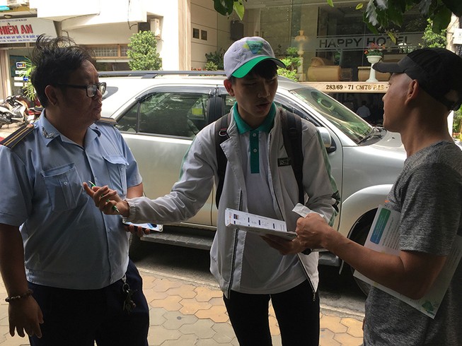Nhân viên đô thị và nhân viên Viettel ra sức hướng dẫn cài đặt My Parking, còn tài xế thì “em chả”. (Ảnh chụp tại hẻm 295 Cách Mạng Tháng Tám, quận 10) Ảnh: LƯU ĐỨC