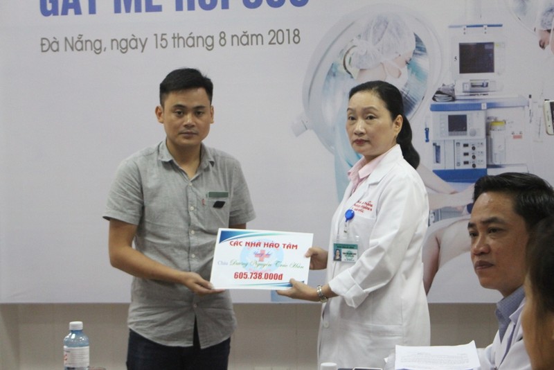 Phó Giám đốc BV Đà Nẵng Trần Thị Khánh Ngọc trao tiền ủng hộ cho gia đình bé Dương Nguyễn Trúc Hân