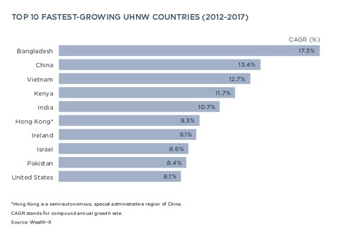 Tính trong giai đoạn 2012 -2017, trong nhóm 10 nước có tốc độ tăng trưởng bình quân hằng năm về giới siêu giàu thì Việt Nam đứng thứ 3 thế giới, với tốc độ tăng trưởng là 12,7%/năm, chỉ xếp sau Bangladesh, Trung Quốc và đứng trên cả Mỹ, Hong Kong, Ấn Độ. Như vậy mỗi năm, số người có tài sản từ 30 triệu USD trở lên tại Việt Nam tăng gần 13%.