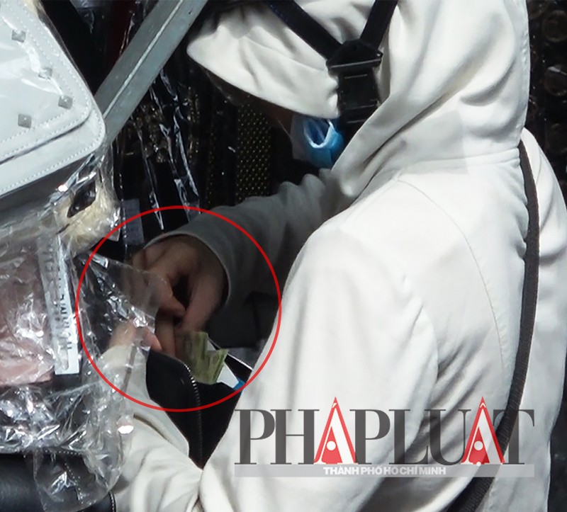 Chủ sạp cầm những tờ giống tiền và vỏ khăn ướt ra chỗ khuất, sau đó nhét vỏ khăn lên kệ cho vị cảnh sát lấy đi. Ảnh: PV