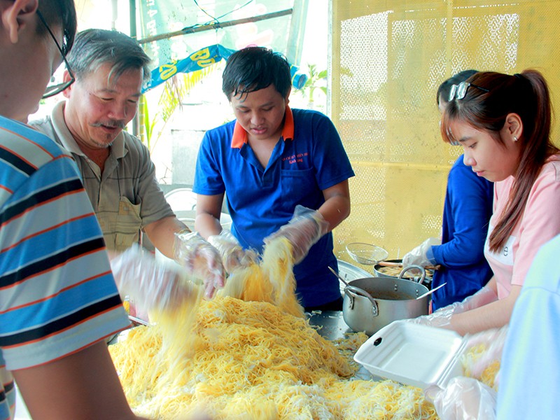 Nhóm đoàn viên phường Hiệp Bình Chánh, quận Thủ Đức thoăn thoắt trộn bún xào. Ảnh: H.KIM