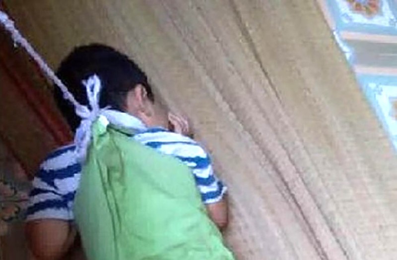 Hình ảnh bé trai bị trói ở cửa số lớp học được một phụ huynh đi đón con chụp lại. Ảnh: Internet