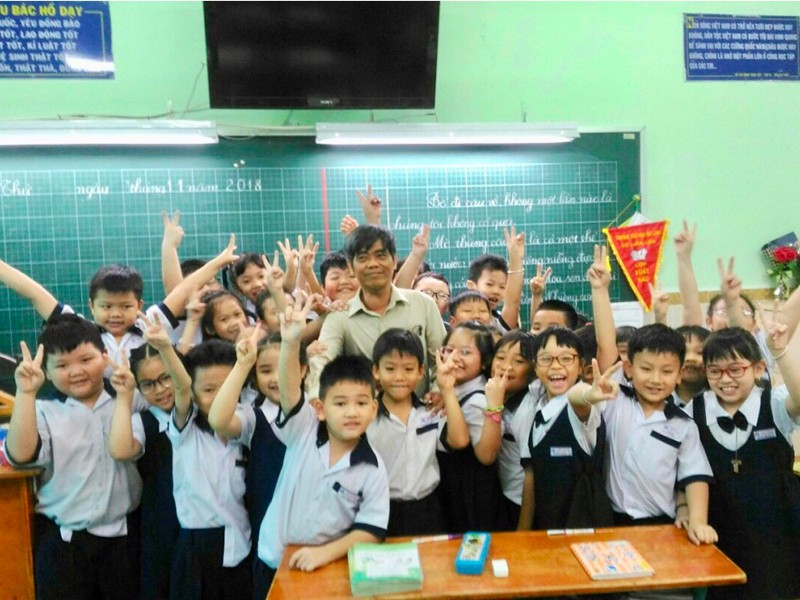 Ông Nguyễn Văn Hùng cùng các học trò tại Trường Tiểu học Mê Linh (quận 3, TP.HCM), nơi ông đang công tác hiện nay. Ảnh: N.QUYÊN