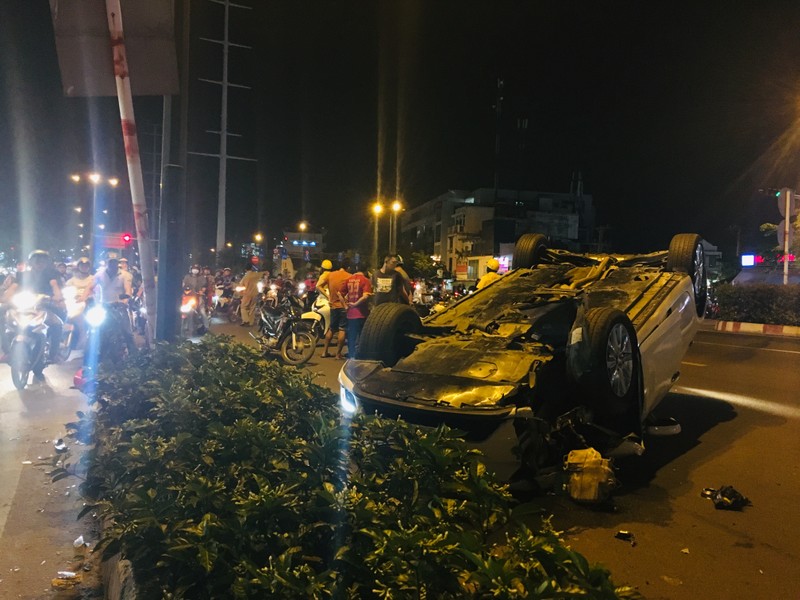 Chiếc xe bị lật nhào, bốn bánh quay ngược lên trời, cửa kính vỡ nát, thân xe bị hư hỏng nặng. Con lươn bị tông mạnh, biển báo giao thông bị méo nghiêng ngả.