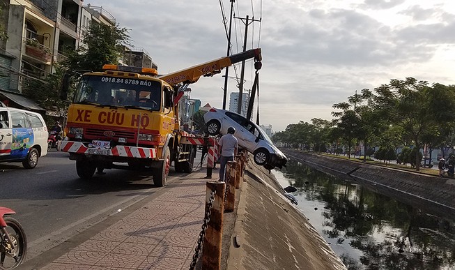 Tại hiện trường, hai cột sắt ta-luy bảo vệ dọc theo tuyến kênh bị tông ngã, đứt xích. Chiếc ô tô bốn chỗ hư hỏng nặng phần đầu, hông, một phần thân xe ngập trong nước, tài xế kẹt bên trong.