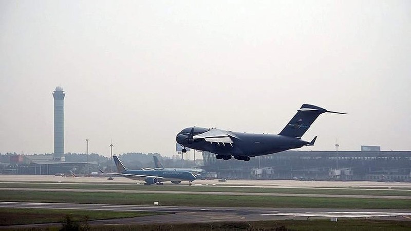 Khoảng 13 giờ chiều nay, 20-2, một máy bay vận tải C-17 với biệt danh "Globemaster - bá chủ địa cầu" của không quân Mỹ hạ cánh xuống sân bay Nội Bài của Hà Nội.