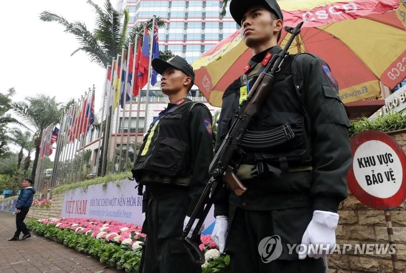 Nhân viên an ninh canh gác gần khách sạn Melia Hanoi - một địa điểm có thể sẽ là nơi ở của lãnh đạo Triều Tiên Kim Jong-un, ngày 25-2. Ảnh: YONHAP