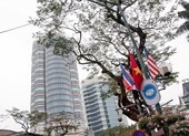 Nhiều hoa tươi, quốc kỳ ba nước Mỹ-Triều Tiên- Việt Nam được treo quanh khu vực. Ảnh: LAN NGUYỄN