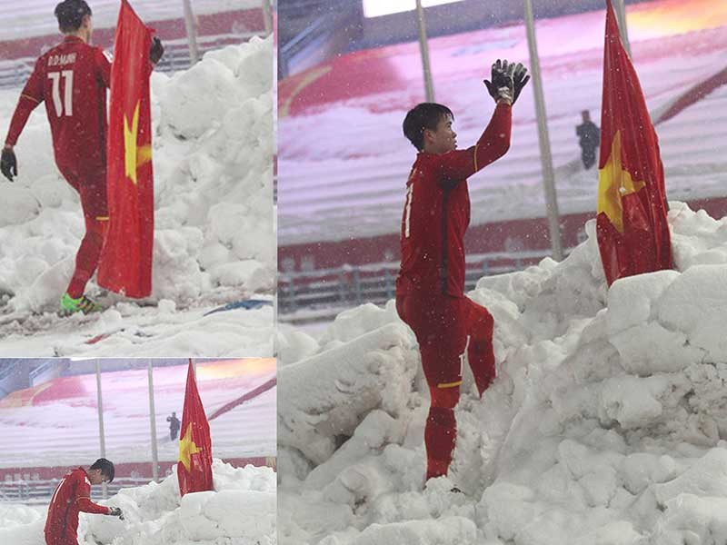Lúc đó tình cờ các bạn đi trước. Em đi cuối cùng với HLV thể lực đang khoác vai động viên em đừng khóc nữa. Trước mặt em lúc đó là một đống tuyết cao. Người hâm mộ vẫy em, gọi tên em. Em đang cầm một lá cờ và em nảy ý định cắm lá cờ này ở đây. Suy nghĩ của em lúc đó rằng sau này có nhìn lại khoảnh khắc cắm lá cờ Tổ quốc thì mình vẫn nhớ đến những kỷ niệm ở Trung Quốc. Khi cắm, nước mắt em vẫn rơi vì tiếc nuối xen lẫn niềm tự hào vì làm được điều gì đó cống hiến cho Tổ quốc. Lúc cắm xong em có cúi chào người hâm mộ, cúi chào lá cờ và đi theo đồng đội…”.