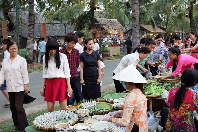 Nhiều món ngon, đặc sản Việt được du khách trong và ngoài nước rất ưa chuộng. Trong ảnh: Gian hàng món ngon Việt tại khu du lịch Văn Thánh. Ảnh: TÚ UYÊN
