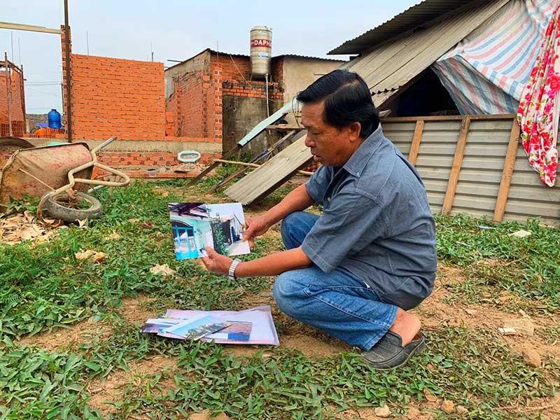 Ông Huỳnh Văn Y và những bức ảnh chụp hiện trạng căn nhà cũ xây từ năm 1985 bên cạnh căn nhà mới đang tạm đình chỉ. Ảnh: VIỆT HOA