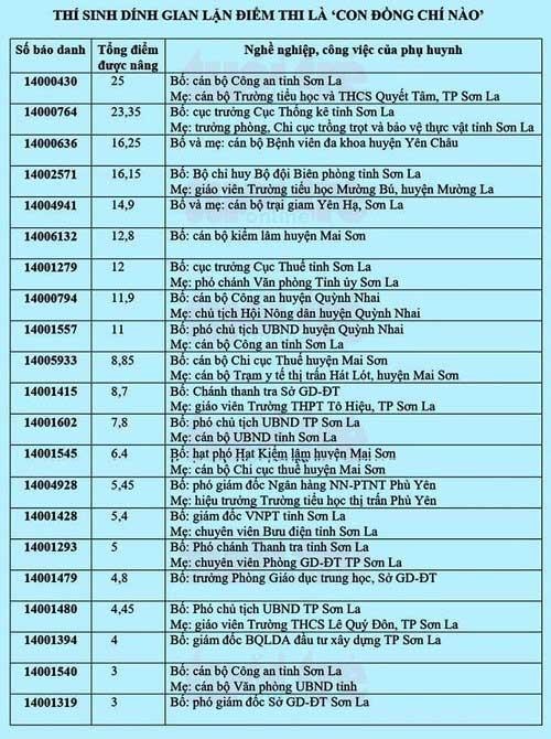 Trong danh sách được báo Tuổi Trẻ công bố có những thí sinh là con lãnh đạo được nâng tới 25, 26,55 điểm/ba môn. Ví dụ, thí sinh mang số báo danh 14000430. Em này có năm môn được nâng tới 25 điểm, trong đó toán từ 2,6 điểm thành 9,4 điểm, vật lý từ 2,75 điểm lên 9,5 điểm. Thí sinh này có cha là một cán bộ cấp phòng Công an tỉnh Sơn La.