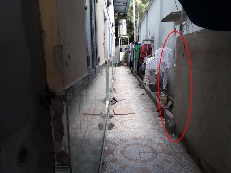 Dãy phòng trọ sát nhà nạn nhân đều bị dây kẽm cột chặt ngoài cửa. Vòng tròn đỏ là lối thông sang nhà nạn nhân.