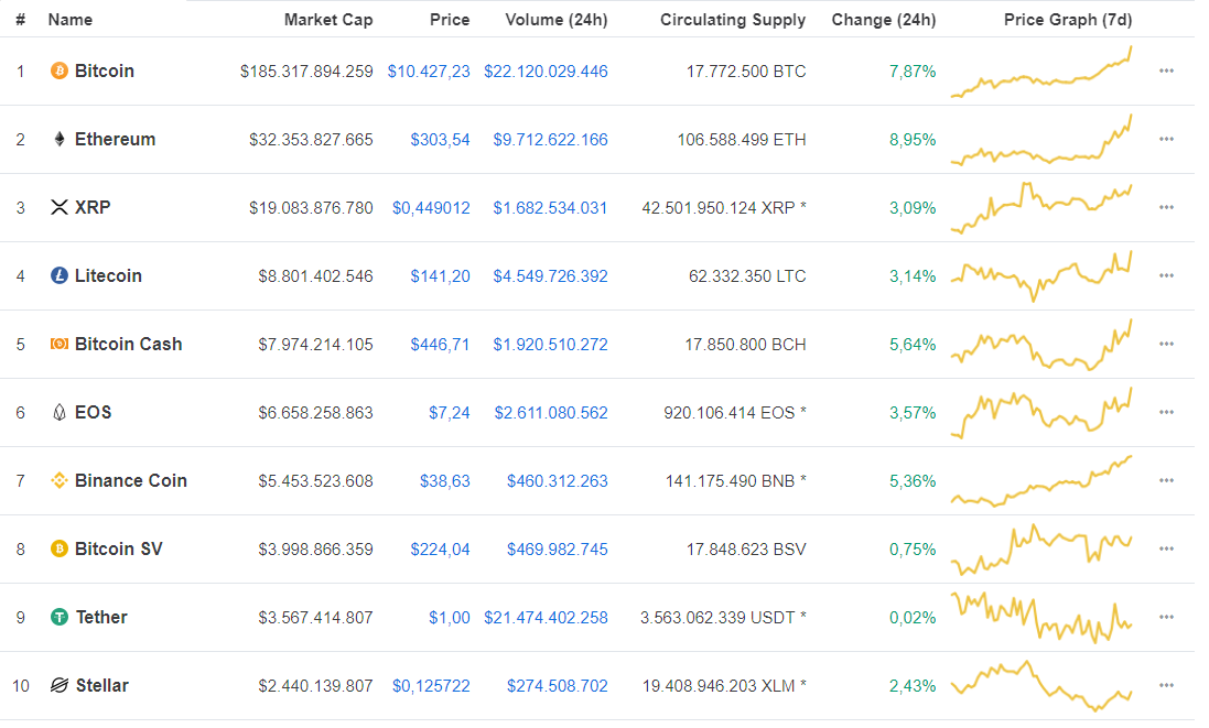 Top 10 đồng tiền kỹ thuật số đều tăng trong 24 giờ qua. Những đồng tiền kỹ thuật số lớn như Ethereum, XRP, Litecoin,…đều tăng mạnh: Ethereum tăng 9,65% lên 304,53 USD/ETH, XRP tăng 3,51%, Litecoin tăng 3,19%,… Bitcoin cash tăng đến 5,35% trong 24 giờ qua, lên 439,88 USD.