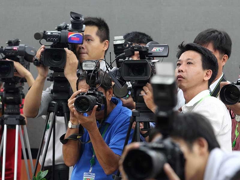 Các phóng viên tác nghiệp tại một sự kiện. Ảnh: HOÀNG GIANG