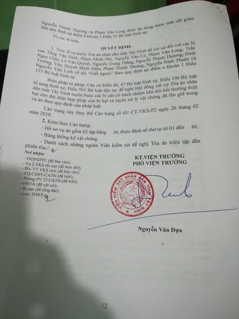 Trước đó ngày 25-6, TAND tỉnh Tây Ninh quyết định trả hồ sơ để điều tra bổ sung đối với 13 bị cáo để truy tố thêm tội cố ý gây thương tích. Tuy nhiên, qua điều tra bổ sung, cơ quan tố tụng xác định không đủ cơ sở để truy tố thêm tội danh này, nên VKS ban hành cáo trạng truy tố tội danh như cũ.