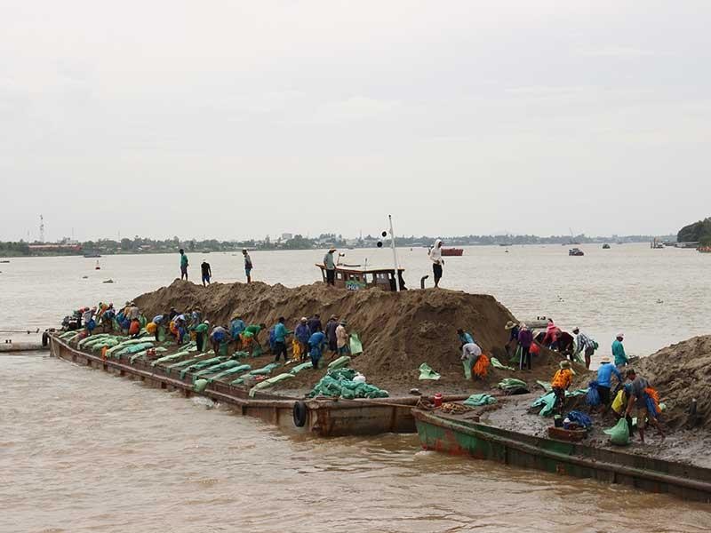 Đơn vị thi công dùng bao cát thả xuống sông Hậu lấp hố xoáy khắc phục sạt lở. Ảnh: HẢI DƯƠNG