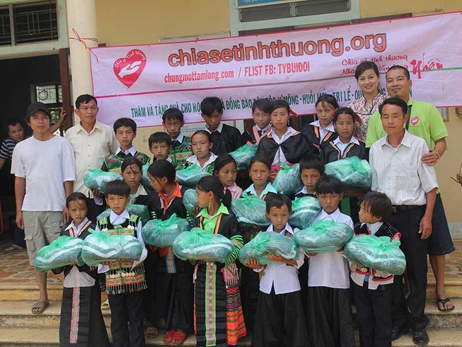 Mạnh thường quân trao quà cho trẻ em nghèo tại Huế. Ảnh: VIẾT LONG