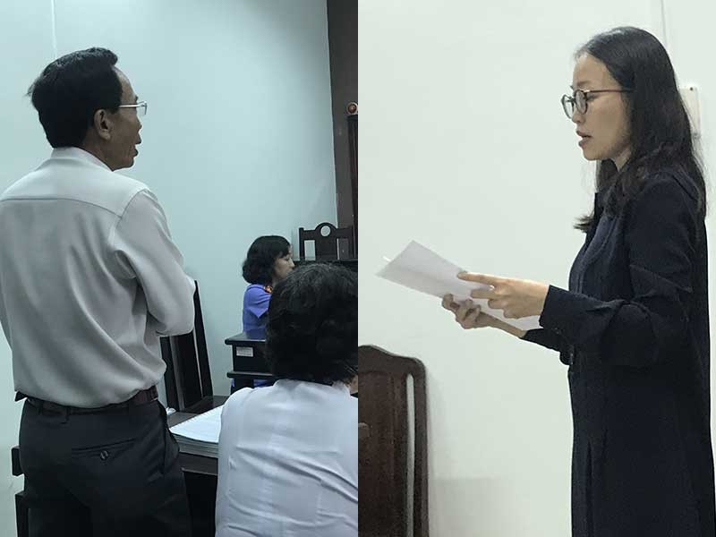 Đại diện nguyên đơn (trái) và đại diện bị đơn tại tòa ngày 22-10. Ảnh: MV