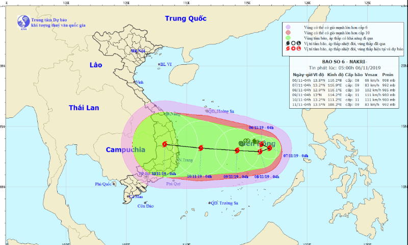 Đến sáng 7-11, vị trí tâm bão ở khoảng 13,2 độ Vĩ Bắc; 116,9 độ Kinh Đông, cách đảo Song Tử Tây 330 km về phía đông bắc. Sức gió mạnh nhất vùng gần tâm bão số 6 mạnh cấp 9 (75-90 km/giờ), giật cấp 11.