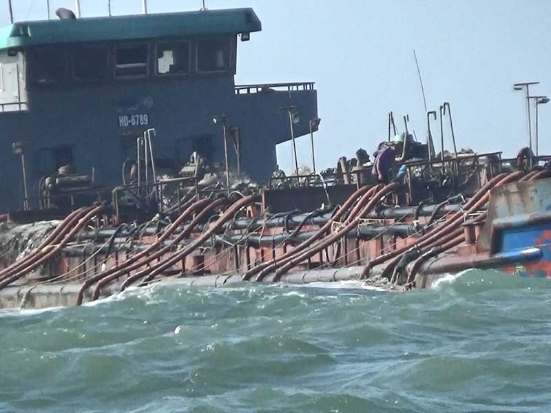 14 giờ 53 phút, sà lan dài số hiệu HP-4099 trong nhóm trên có khoảng 30 vòi hút ở hai bên mạn vừa hoàn thành việc thả ống xuống lòng biển. Trong vài giây sau, hàng chục vòi nước lớn màu đục được hút lên boong kéo theo hàng chục mét khối cát từ lòng biển.