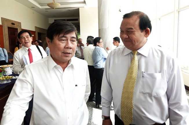 Chủ tịch Nguyễn Thành Phong (bên trái) trao đổi với ông Lê Minh Tấn bên lề hội nghị. Ảnh: PHƯƠNG THÙY