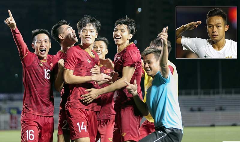Rizki Sani chào ngạo nghễ với bàn mở tỉ số (ảnh nhỏ) nhưng kiểu chào của toàn đội U-22 Việt Nam ở phút 90+1 đẹp hơn rất nhiều. Ảnh: ANH PHƯƠNG