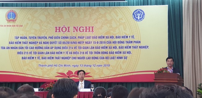 Ngày 13-12, tại TP.HCM, TAND Tối cao tổ chức hội nghị tập huấn, tuyên truyền, phổ biến chính sách, pháp luật về bảo hiểm xã hội (BHXH), bảo hiểm y tế (BHYT), bảo hiểm thất nghiệp (BHTN) và Nghị quyết 05 của Hội đồng Thẩm phán TAND Tối cao hướng dẫn áp dụng về tội gian lận, trốn đóng BHXH, BHYT, BHTN của BLHS (hiệu lực thi hành từ ngày 1-9-2019).
