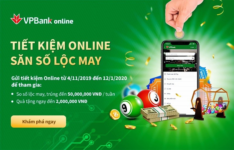Tại VPBank, từ nay đến hết 12-1-2020, khách hàng lần đầu gửi tiết kiệm trực tuyến trên VPBank Online và tại các máy CDM/ATM với số tiền từ 30 triệu đồng, kỳ hạn 6 tháng trở lên, sẽ được nhận ngay tiền thưởng khuyến mãi lên đến 2 triệu đồng tùy theo giá trị khoản tiền gửi. Số tiền này sẽ được chuyển vào tài khoản của khách hàng sau 10 ngày làm việc kể từ khi khách hàng mở tài khoản tiết kiệm thành công.