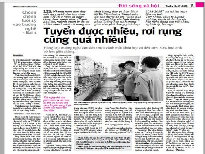 Trong đó, bài 1 có nội dung “Dạy nghề: Tuyển được nhiều, rơi rụng cũng quá nhiều!”. Bài báo phản ánh thực tế việc hàng loạt trường nghề đau đầu trước cảnh mỗi khóa học có đến 30%-50% học sinh bỏ học giữa chừng.
