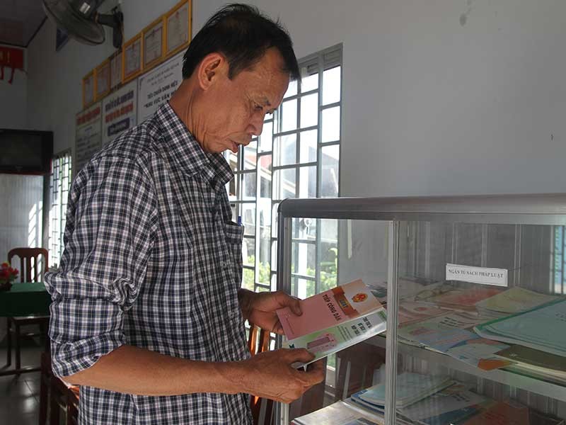 Ngoài những buổi được tập huấn, ông Võ Ngọc Thành còn tự trau dồi kiến thức pháp luật thông qua tủ sách pháp luật ở khu vực. Ảnh: HẢI DƯƠNG